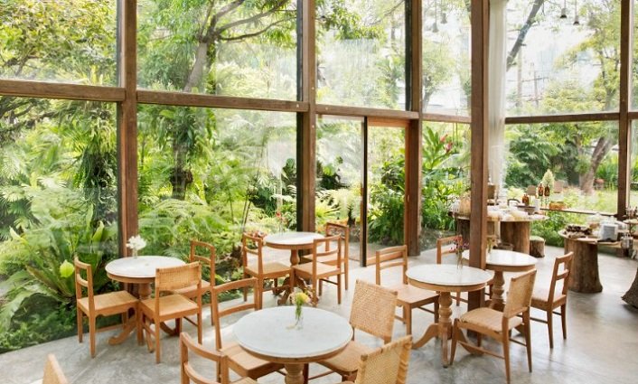 A serene glasshouse café surrounded by greenery invites Bangkok diners to reconnect with organic living.